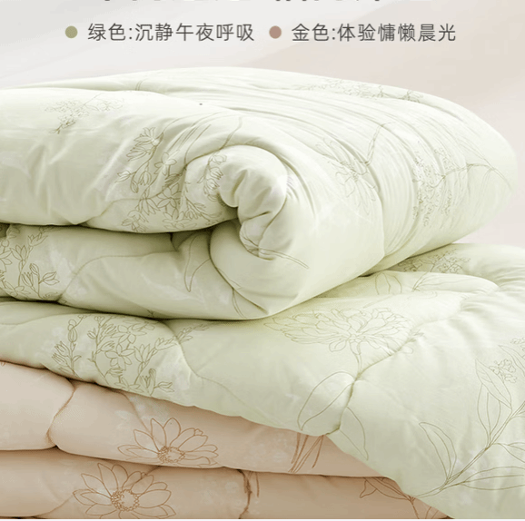 (被子参考图片) (外包装参考图片) | 品牌:罗莱(LUOLAI) 款式:绿色/金色 尺寸:150×215cm 填充物:180g 净重:约1000g/2.0斤 面料材质:100%棉 填充材质:100%聚酯纤维 生产商:罗莱生活科技股份有限公司 地址:江苏省南通经济技术开发区星湖大道1699号